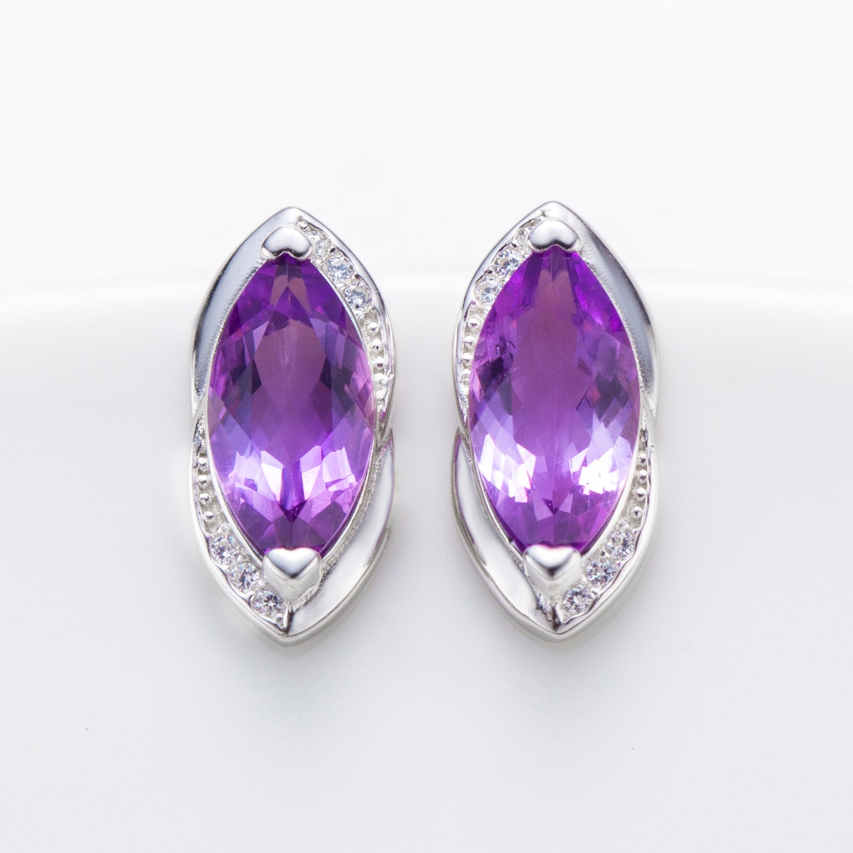 Fashion sterling silver earrings with natural gemstone of Amethyst, marquise shape in size 5*10 mm. Natural gem earrings, silver earrings wholesale.