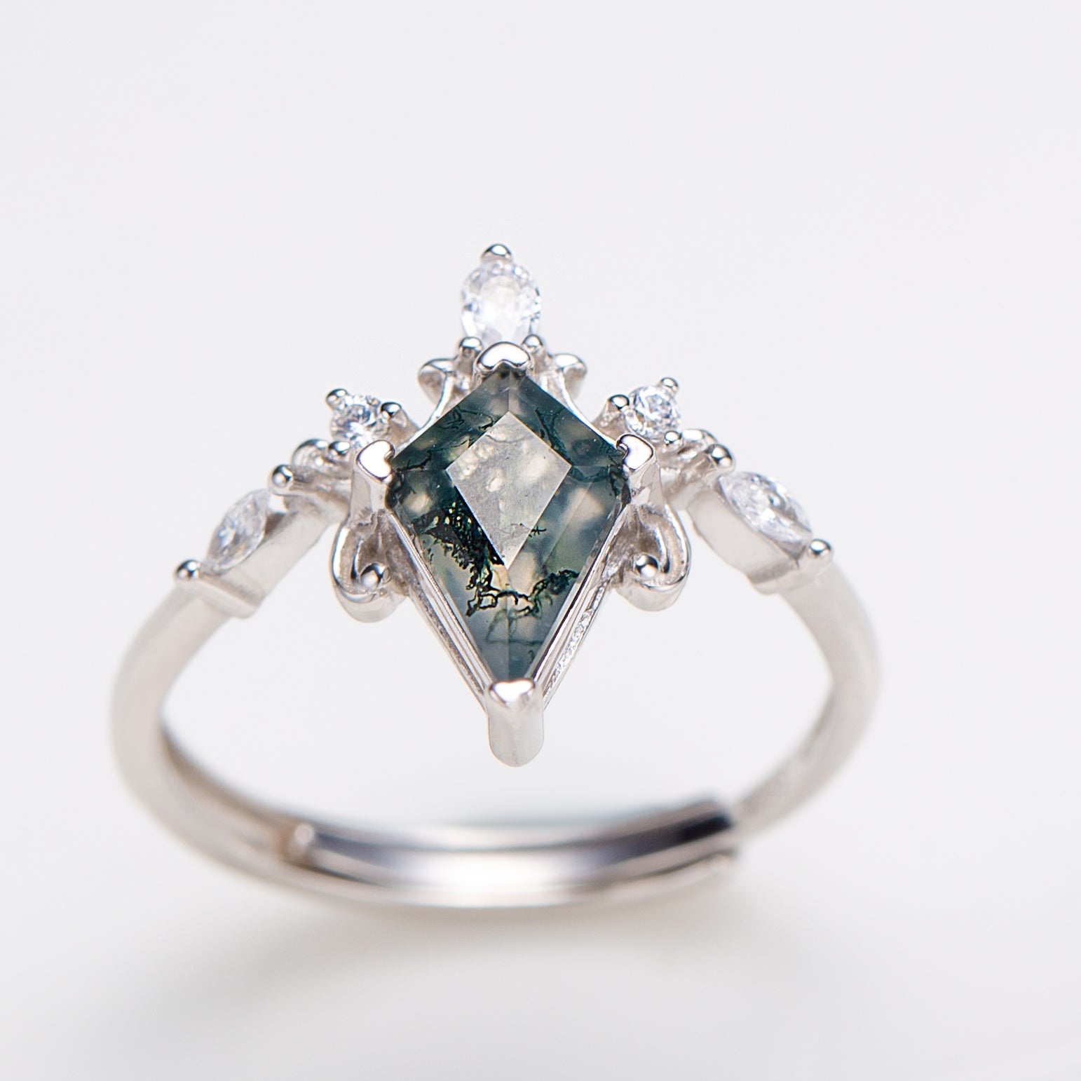 This is a fashion sterling silver ring with natural gemstone of Moss Agate, adjustable size, Kite shape in size 6*9 mm Moss Agate gemstone. Natural gem ring, silver rings wholesale.
