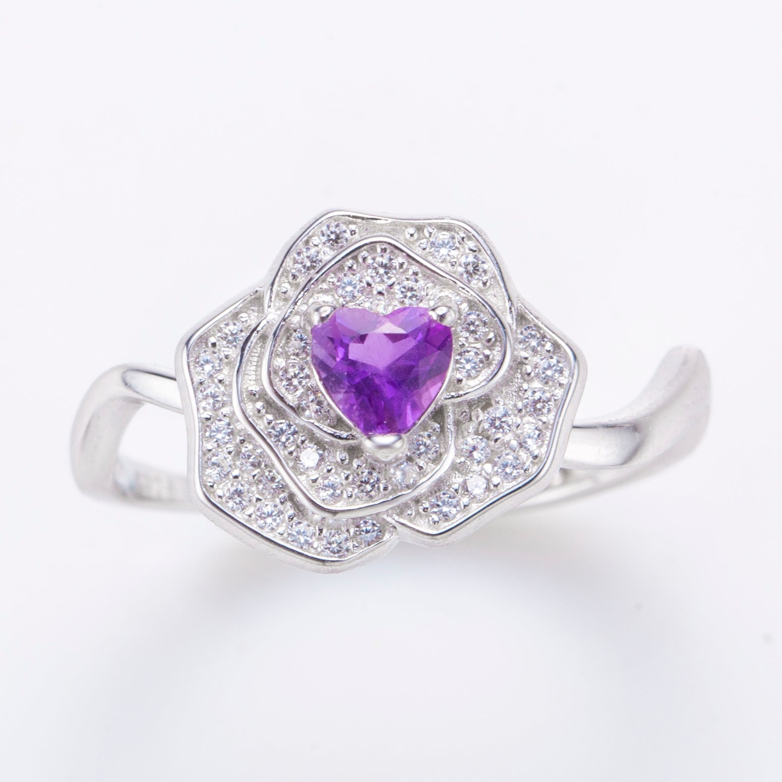 Natural Heart Amethyst Sterling Silver Rose Ring