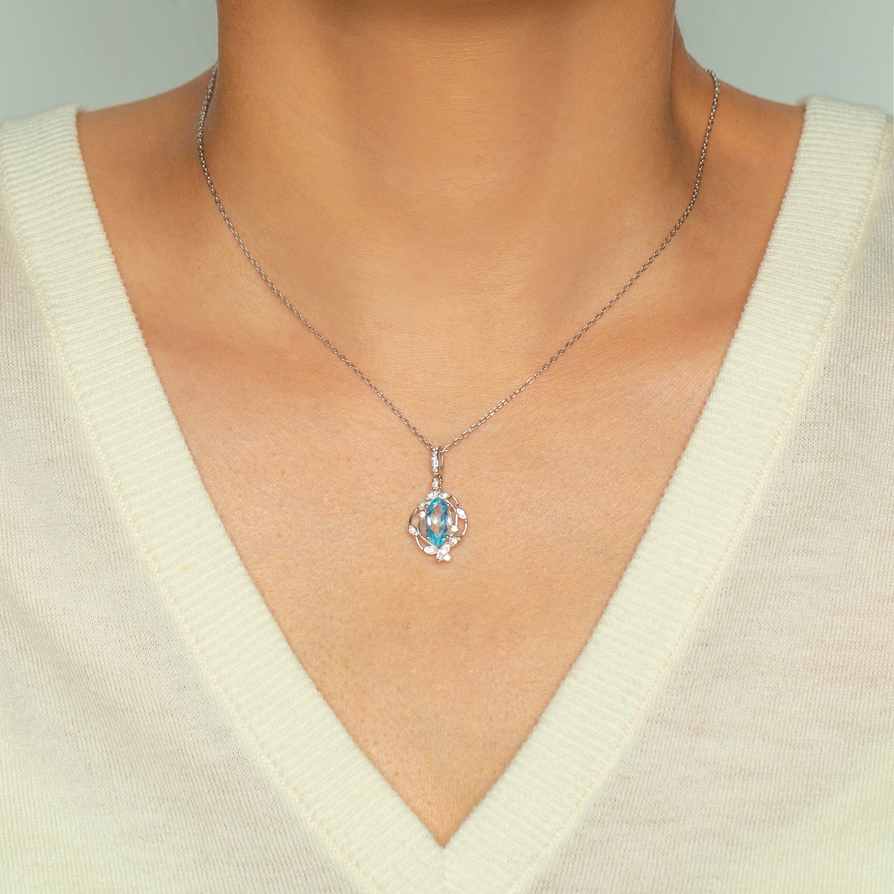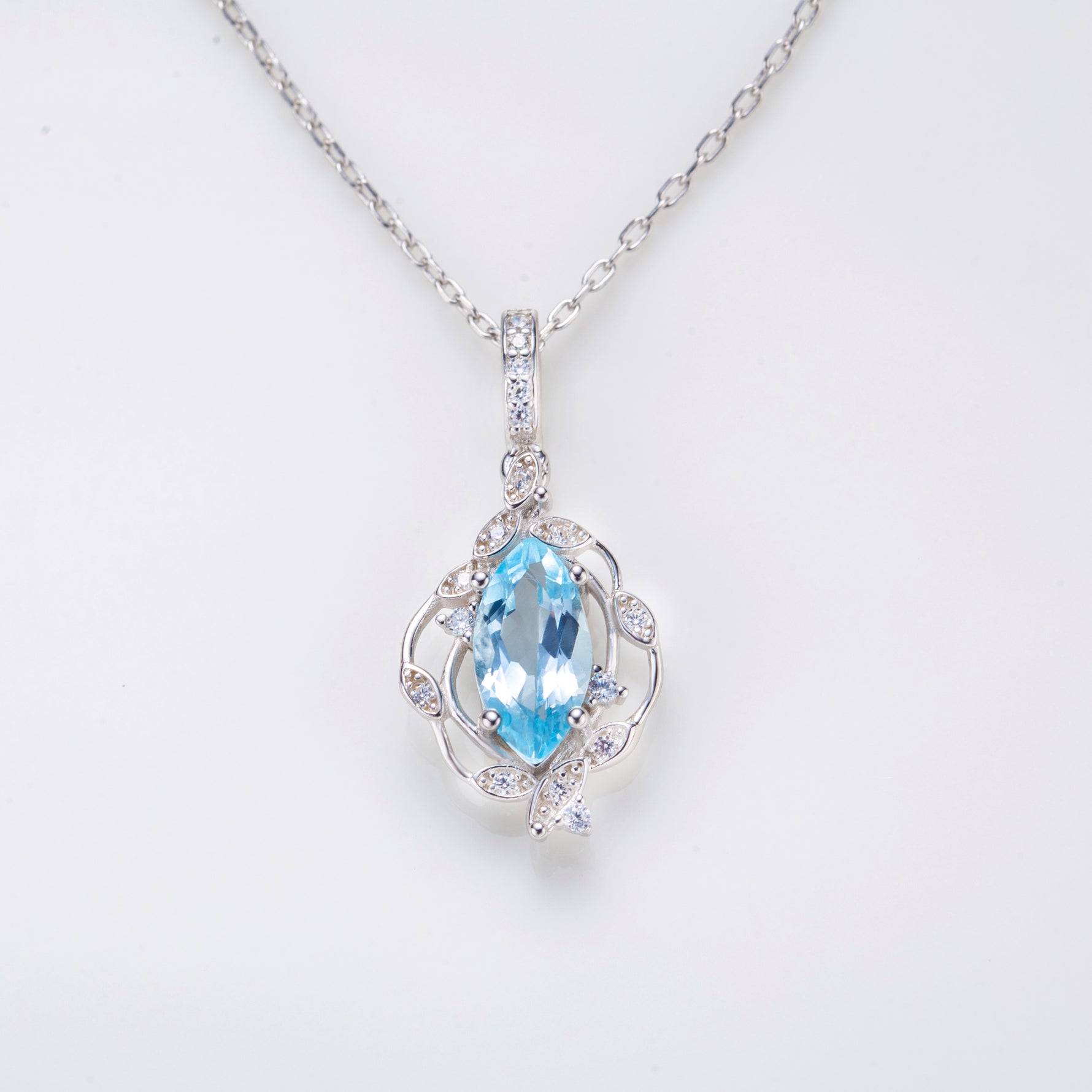Wholesale marquise cut sky blue topaz necklace features precision faceting for exceptional brilliance. Perfect for retailers seeking premium wholesale gemstone necklaces, this statement necklace offers superior value in fine jewelry collections. A captivating solitaire pendant design.